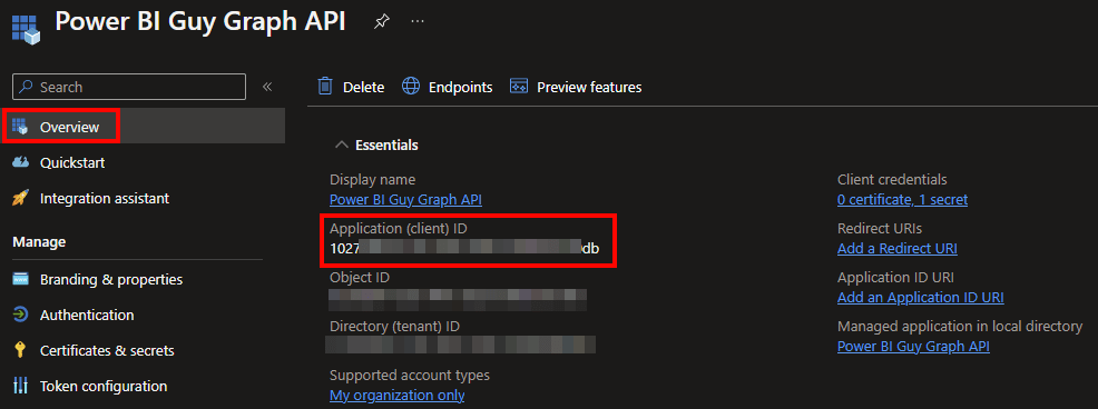 In my next block of code, I set the needed variables. I start with the Service Principal ID or also called Client ID. This can be found in Azure Portal by selecting the newly created App and in the Overview screen, you’ll find the Client ID at the top.