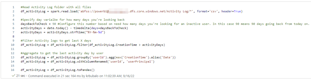 So far, we have logged in via a Service Principal, got all users from AAD and the assigned licenses for each user. As a next step, we have to check the last activity date for each user. Here comes the superpower of Azure Synapse! As mentioned already, in one of my last blog posts I showed how I use Python to store Activity Logs in Azure Data Lake Gen2 – see https://pbi-guy.com/2022/03/10/power-bi-and-activity-logs-with-python/ I’m going to reuse this work and just read all the CSV files already stored with pySpark and store it into the df_activityLog DataFrame. Pay attention to “*” at the end of my path to read all CSV files, not only one.