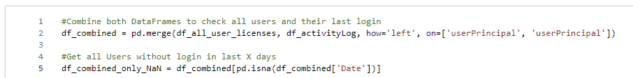 As I’m not interested of what kind of activities have happened, I’ll just group my df_activityLog by UserID and get the max date out of it to see the last activity Date. Obviously, you could specify filters to check for specific activities like “View Report” or similar. But I decided to count every activity the same meaning as long as there is some kind of activity, the license is needed. To not mix things up, I rename the userId from the activity log to userPrincipal – which is more reliable and correct from my point of view. Last piece of the code is to convert the pySpark DataFrame to a Pandas DataFrame to be able to merge it afterwards easily.
