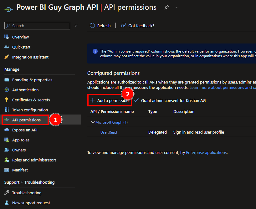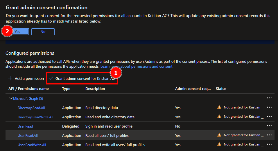 After the permissions have been added, we have to grant admin consent to be able to call the API and read our necessary information.