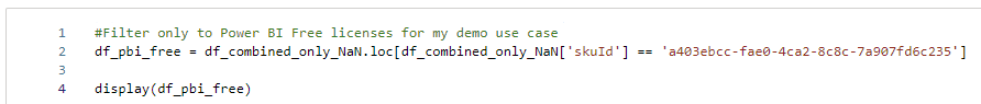 As I’m doing this for demo purpose only, I will focus on removing Power BI Free licenses. Of course, there is no cost behind this license and in a real-world scenario I would focus especially on Power BI Pro (and probably Power BI Premium Per User), but the approach is absolutely the same, regardless which license you wish to remove. Therefore, I add an extra code block to filter down to only Power BI free licenses.