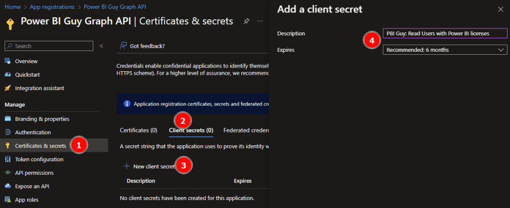 Lastly, we have to create a secret (that’s like a password for our SP) to be able to log in with the SP. To do so, select Certificates & secrets on the left, select Client secrets, and hit the + New client secret. Give a recognizable description and an expires timeline. In my case I’ll use “PBI Guy: Read Users with Power BI licenses” and 6 months expiration.