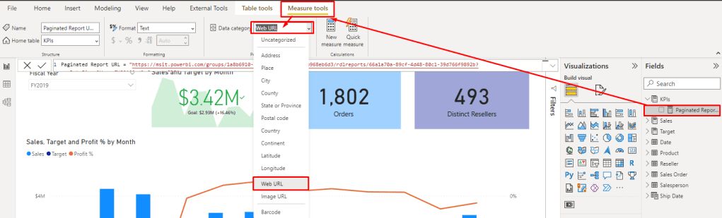 After opening the Power BI Report in Power BI Desktop we can add a simply DAX measure with our hardcoded URL to call the Paginated Report.