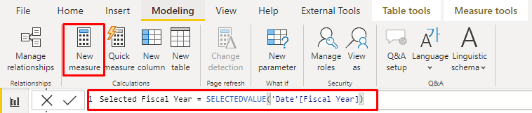 Selected Fiscal Year = SELECTEDVALUE(‘Date'[Fiscal Year])