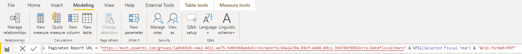 Paginated Report URL = “https://msit.powerbi.com/groups/1a8b6910-c4a2-4611-ae75-5d0b968eb6d3/rdlreports/66a1a70a-89cf-4d48-80c1-39d766f9892b?rp:DateFiscalYear=” & KPIs[Selected Fiscal Year] & “&rdl:format=PDF”