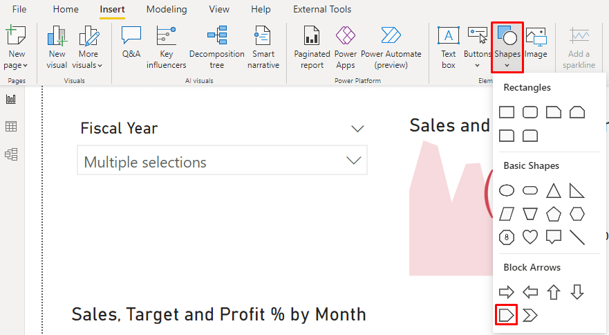 In my case I choose the Pentagon Row shape and add it into my report. Of course you can modify it as wished or even use a visual instead of a shape / button to achieve the same result (open the paginated report).