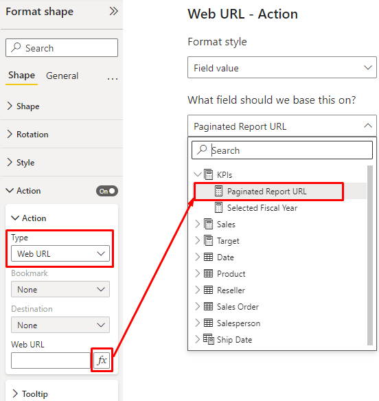 Position the shape and configure it as needed. Lastly modify the Action property, set the Type to Web URL and configure our DAX Measure to be used as Web URL.