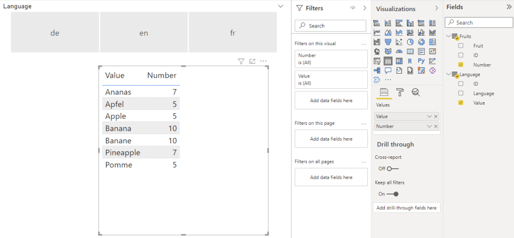As a next step you can add a Slicer Visual using the Language column from the Language table and add a Table Visual with the Number Column from the Fruits table and Value Column from the Language table.