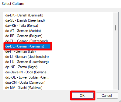 A new window will pop-up where you can choose which culture you wish to add. In my case I select de-DE and hit OK. This means once translations are implemented in de-DE language Power BI will recognize the Browser or Power BI Desktop Language Settings and display automatically the translation of my tables and columns in this language.